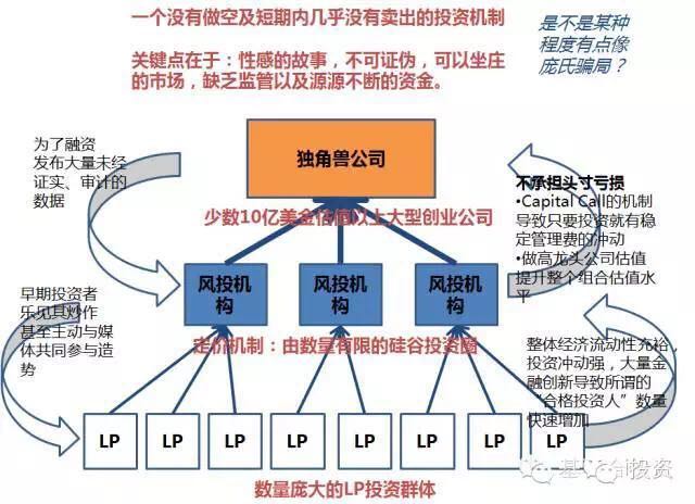 有一点区别在于在这个没有卖出机制的市场中,定价机制是:由数量有限的硅谷(或其他地区)投资圈决定。而这类投资圈的投资公司均不承担头寸亏损,而Capital Call的机制,导致必须要有投资才能收取稳定管理费的冲动。而在联合坐庄更加容易、又缺乏监管的市场,拉高龙头公司估值提升整个组合估值水平的冲动,似乎又很容易形成默契。