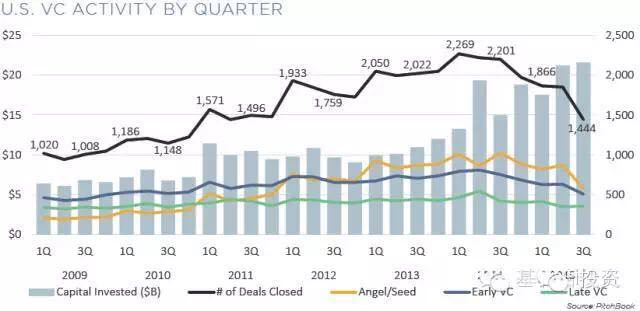 从全球火车头的美国市场来看,3季度VC市场继续有降温的趋势,除了依靠少数大项目支撑保持投资规模维持在200亿美金以上外,投资笔数已经快速回落至1444笔,无论同比还是环比都有较大幅度滑坡。