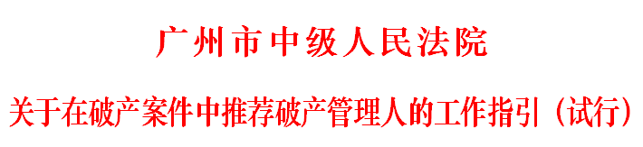 为进一步完善破产案件管理人选任机制,依法保障债权人等利益相关方的破产程序参与权,现将《广州市中级人民法院关于在破产案件中推荐破产管理人的工作指引(试行)》印发给你们,请遵照执行。