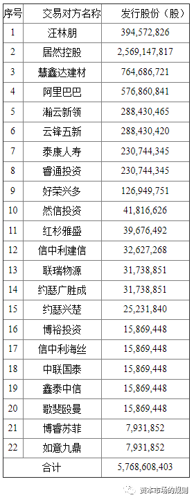 本次交易中,上市公司拟通过向特定对象非公开发行股份的方式购买居然控股等22名交易对方持有的居然新零售100%股权。本次交易完成后,居然新零售将成为上市公司的全资子公司,居然控股等22名交易对方将成为上市公司的股东。本次发行股份购买资产的交易价格以具有证券期货相关业务资格的开元评估出具并经武汉市国资委核准的标的资产截至评估基准日的评估值3,567,401.00万元为基础,经交易双方友好协商,确定为3,565,000.00万元。按照《重组管理办法》第四十五条规定,上市公司发行股份购买资产的发行价格不得低于市场参考价的90%。市场参考价为本次发行股份购买资产的首次董事会决议公告日前20个交易日、60个交易日或者120个交易日的上市公司股票交易均价之一。本次交易采用发行股份方式,发行股份定价基准日为上市公司2019年第二次临时董事会会议决议公告日,发行价格为6.18元/股,不低于定价基准日前60个交易日上市公司股票均价的90%,符合《重组管理办法》的相关规定。定价基准日至发行日期间,若公司发生派息、送红股、转增股本或配股等除息、除权行为,本次发行价格将根据中国证监会及深交所的相关规定进行相应调整。本次交易拟购买资产作价3,565,000.00万元,按照本次发行股票价格6.18元/股计算,本次拟发行的A股股票数量为5,768,608,403股,上市公司向居然控股等22名交易对方发行股份的具体数量如下表:注:经计算不足1股部分对应的资产,居然新零售全体股东无偿赠予上市公司。定价基准日至发行日期间,若公司发生派息、送红股、转增股本或配股等除息、除权行为,本次发行价格将根据中国证监会及深交所的相关规定进行相应调整,发行股数也随之进行调整。截至本报告书签署日,上市公司总股本为251,221,698股。按照本次交易方案,公司本次将发行5,768,608,403股A股股票用于购买居然新零售100%股权。本次交易完成前后公司的股本结构如下:本次交易完成后,上市公司的控股股东将变更为居然控股,居然控股将直接持有上市公司42.68%的股份;上市公司实际控制人将变更为汪林朋,汪林朋及其一致行动人合计控制上市公司61.94%股份。韵达快递借壳新海股份