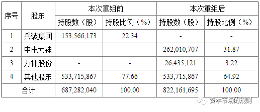 截至本报告书签署日,兵装集团直接持有上市公司15,356.62万股,持股比例为22.34%,兵装集团获得全部所需批准后拟向中国电子科技集团有限公司全资子公司中电力神无偿划转其持有的全部中国嘉陵股份。上市公司拟以现金方式向兵装集团出售截至2018年1月31日的全部资产及负债。在本次资产出售过程中,为了提高拟出售资产出售的实施效率,便于将来的资产交割,拟出售资产、负债及全部人员将先由重庆嘉陵承接,并以兵装集团购买重庆嘉陵100%股权的形式实现资产、负债及全部人员的置出。上市公司拟向中电力神发行股份购买其持有的空间电源100%股权,向力神股份发行股份购买其持有的力神特电85%股权。上市公司未购买力神特电全部股权的原因、后续有无收购剩余股权的安排根据上市公司及力神股份的说明,中国嘉陵就本次交易事项停牌后,在履行相关国资主管部门的沟通程序之后,首先与本次交易发行股份之交易对方中电力神及力神股份就交易方案框架沟通达成一致,其后通过力神股份与秦开宇沟通协商收购股权的相关事宜。截至各相关方向主管部门上报方案之时,中国嘉陵与秦开宇就收购条件未能达成一致。为了有效推进重组进程,秦开宇未作为交易对方参与本次交易。本次重大资产重组完成后,上市公司将取得力神特电85%的股权。截至本报告书签署日,对于秦开宇所持的15%力神特电股权,上市公司暂无后续收购计划。3、上市公司未与秦开宇就优先受让标的股权及力神特电在交易后的公司治理等进行特别约定力神特电为股份有限公司,根据《公司法》及力神特电章程,秦开宇在力神特电的股份转让中并不享有优先受让权。截至本报告书签署日,上市公司与秦开宇并未就标的股权的优先受让进行特别约定。根据力神特电章程,力神特电的最高权力机构为股东大会,股东根据所持股份比例行使表决权,本次重组完成后,上市公司将持有力神特电85%的股份并根据股权比例行使表决权;力神特电的董事会由5名董事组成,董事均由股东单位推荐。力神特电现有的5名董事中,除秦开宇外的4名董事均由力神股份推荐;秦开宇目前在力神特电除董事外未担任其他职务。截至本报告书签署日,上市公司并未与秦开宇就交易后力神特电的公司治理进行特别约定。本次注入上市公司的标的资产交易作价为75,262.85万元。按照发行股份价格5.58元/股计算,假定本次上市公司股权无偿划转、重大资产出售、发行股份购买资产均实施完成,相关交易实施前后上市公司的股权结构如下:协鑫能科重组霞客环保
