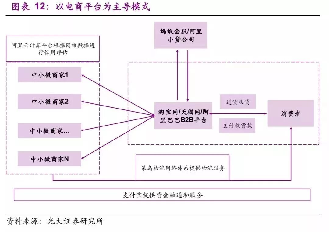 电商平台供应链金融是一个新趋势,例如,蚂蚁金服/支付宝主要是利用阿里生态圈中完善的电商销售、物流服务信息,成为一个现金流闭环的体系。能够实现监督其交易背景的真实性,资金流向的确定性、实现操作的封闭性以及资金的自偿性。这种模式下,没有核心企业,也没有货物的质押过程。资金方依据中小微企业的在阿里网络的采购体系、资金流体系综合分析,提供资金服务,这是一种较为新型的基于供应链体系拓展的金融服务。着重点在于电商平台的采购、运输、销售、资金体系是否具有完整性。