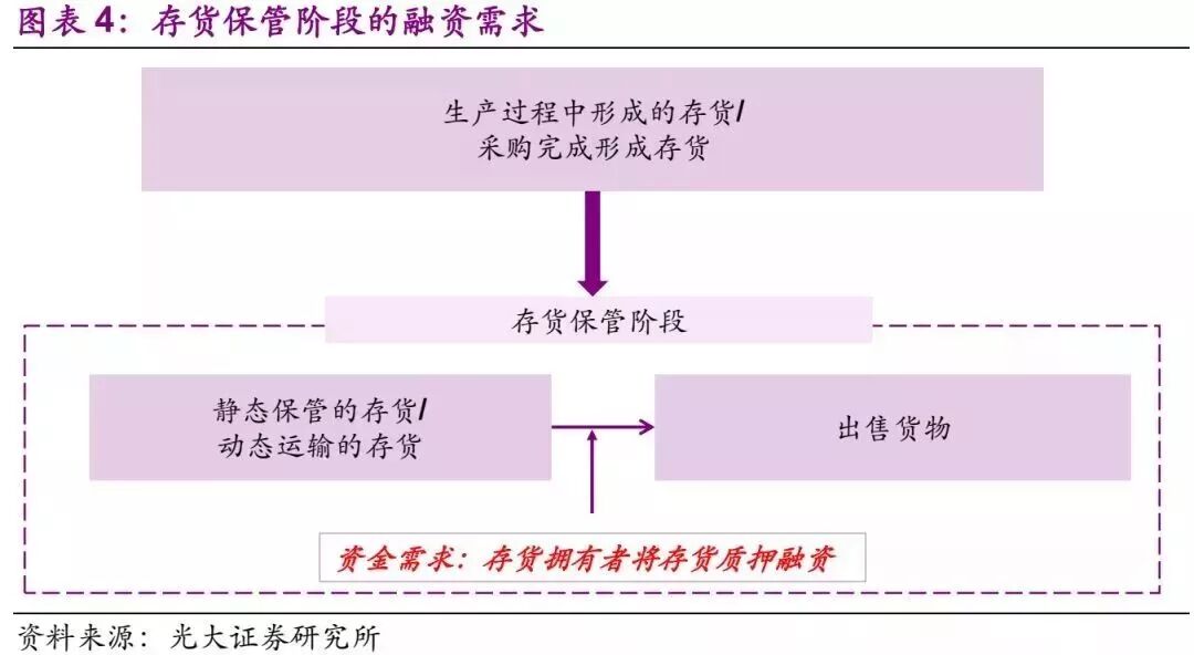 从采购到位至销售完毕,或者生产阶段至销售完毕,均存在一定的时间差,这时候货物资产处于存货保管阶段。存货保管阶段除了在企业自有仓库存放,还可能在物流企业或者港口企业的仓库保存。此外,存货除了静态的存放,也可能表现为处于运输途中的动态阶段。