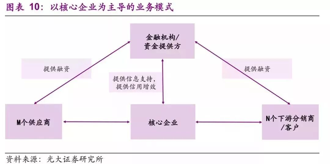 以核心企业为主导的供应链金融模式最为常见,通常为重资产行业企业,依托自身对产业链上下游较强的控制力度,例如汽车、重工机械,采用“M+1+N”模式。金融机构出于对核心企业资信的认可向供应链上下游提供资金支持。