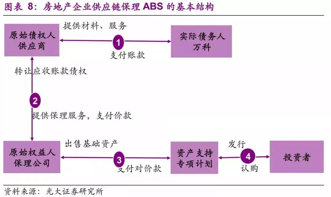 供应链保理ABS是供应链金融与资产证券相结合的模式,这里我们以万科供应链保理ABS为例进行分析。原始债权人为众多的上游供应商,实际债务人是万科集团及下属的项目公司,双方存在应收应付的关系。对于供应商而言,这是一笔由万科作为核心企业,其信用支撑的应收账款收益权,现在将该收益权打包卖给中间的保理商,保理商将该应收账款收益权通过资产支持计划,转化为资产证券化产品,由市场投资者认购份额。到期日,万科将账款划入专项账户,兑付给市场投资者。这里较为关键的环节是:第一步基础资产的确认,需由万科出具付款确认书且作为本项目每笔应收账款债权的共同债务人。也就是这种模式下,同样依赖核心企业的支付能力。