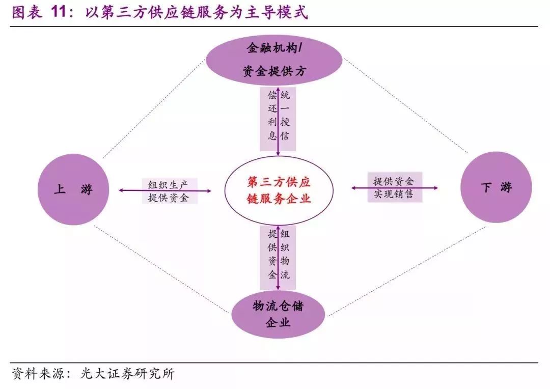 随着供应链金融的发展,以第三方供应链服务为主导模式逐步成熟。我们将其称之为一站式供应链金融服务平台,其整合供应链中的信息流,为企业提供包括通过、结汇、物流、退税、资金融通等业务。这种模式下,对信用风险的控制主要依赖供应链服务商的业务整合能力以及其资信能力,怡亚通是这种模式的代表。现在部分贸易企业、物流企业介入第三方供应链服务这个模式中,也就是说有可能第三方供应链服务企业是多种角色的重合。