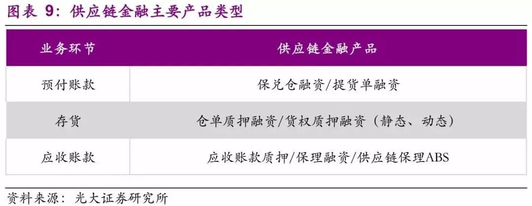 基于供应链金融服务衍生出来的金融产品是多样的,基本上可以总结为:预付款环节下主要是保兑仓融资/提货单融资;存货环节主要是仓单质押融资/货权质押融资;应收账款环节主要是应收账款保理融资、应收账款质押融资、应收账款证券化等。