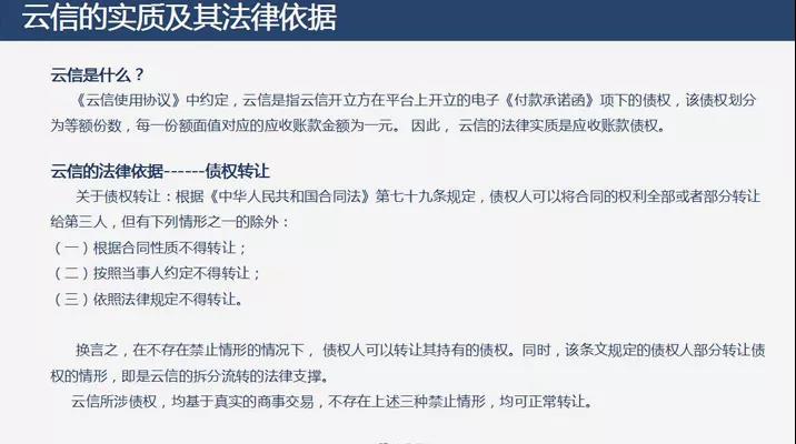 云链金融平台的云信流转融资,本质上为核心企业应收账款在平台上的在线流转和融资。即平台采用信息化系统,配合电子签名技术,把非标准化的“应收账款”封装成了标准化的“电子债权”,实现了整体业务的闭环处理。风控手段方面则是产业链上中小企业借用了核心企业的信用实现增信。