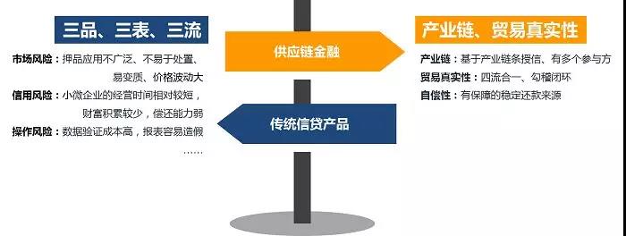 互联网供应链金融的风控则站在产业链整体角度评估, 将供应链中相关企业作为一个整体,基于贸易真实性给予产业链授信,注重资金闭环、四流合一,通过技术手段大幅降低运营成本,所以能够将资金有效注入到供应链中,为相关中小企业提供了灵活、全面的金融产品和服务,是金融体系的有力补充。