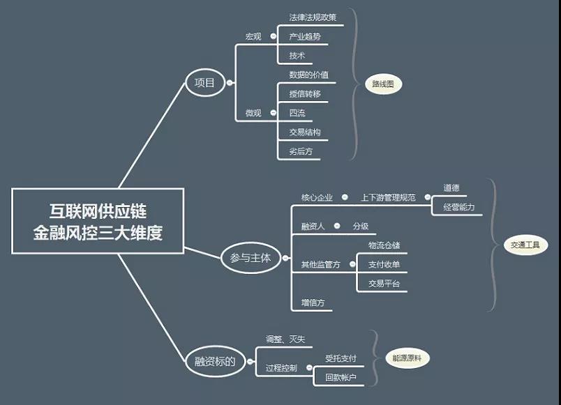 如果以一个互联网供应链金融项目过程为例说明的话,从项目前期立项到后期资金落地运作的风控要点可以归纳为“项目整体、参与主体、融资标的”这三个主要维度。
