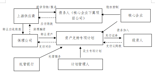 核心企业作为原始权益人的应收账款ABS系国内供应链ABS产品的最初形态,可以简化为“1对N”模式,“1”即核心企业,“N”即下游供应商。典型的应收账款ABS交易结构如下图所示: