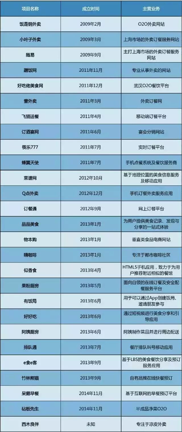 一、互联网+餐饮死亡名单。可谓生的风光,死的惨烈。一番混战后,仅仅留下像美团、大众点评、饿了么这样的行业独角兽。