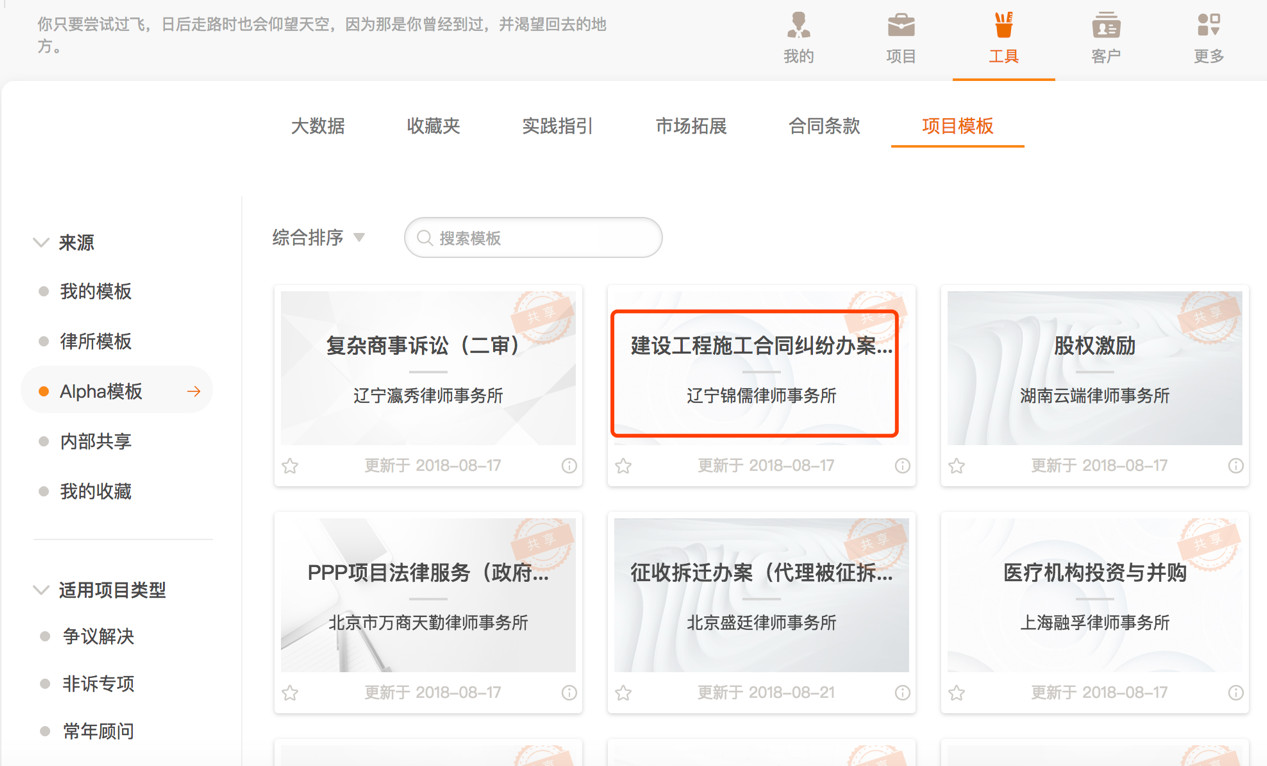 2017年7月,锦儒律师事务所正式引入Alpha系统,其中有一项工具叫做“项目模板”,在资深律师与年轻律师的日常交流中,“如何将我们这十数载所学及积累的经验快速有效地传授给你们,让你们可以少走些弯路”是资深律师最迫切需要解决的问题之一。因此,就有了制作“建设工程施工合同纠纷案件办案模板”这样一份可传承可复制文本的初衷。