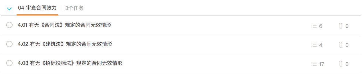 我们先将“经验”总结成文字,再一一设置为任务组-任务-检查项并相应地填充内容。具体以审查合同效力这一要点为例,给大家讲述我们是如何利用Alpha项目管理工具与思维,精细化这套项目模板的吧。