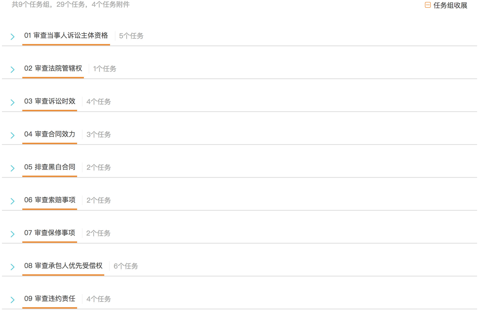 在起草“模板”初期,我们的想法是以“模板”将建设工程合同纠纷这一类案件作为一整套诉讼流程全部体现出来,因此我们确定的任务组为九个阶段——利益冲突及管辖的研究、研究与诉讼有关的期限、审查建设工程施工合同效力、审查索赔事项、审查保修事项、对其他案件事实的审查、庭审前的准备工作、参加庭审、庭审后的协助工作、归档。可以看到前至立案后至归档都是在我们的“模板”范围内的。