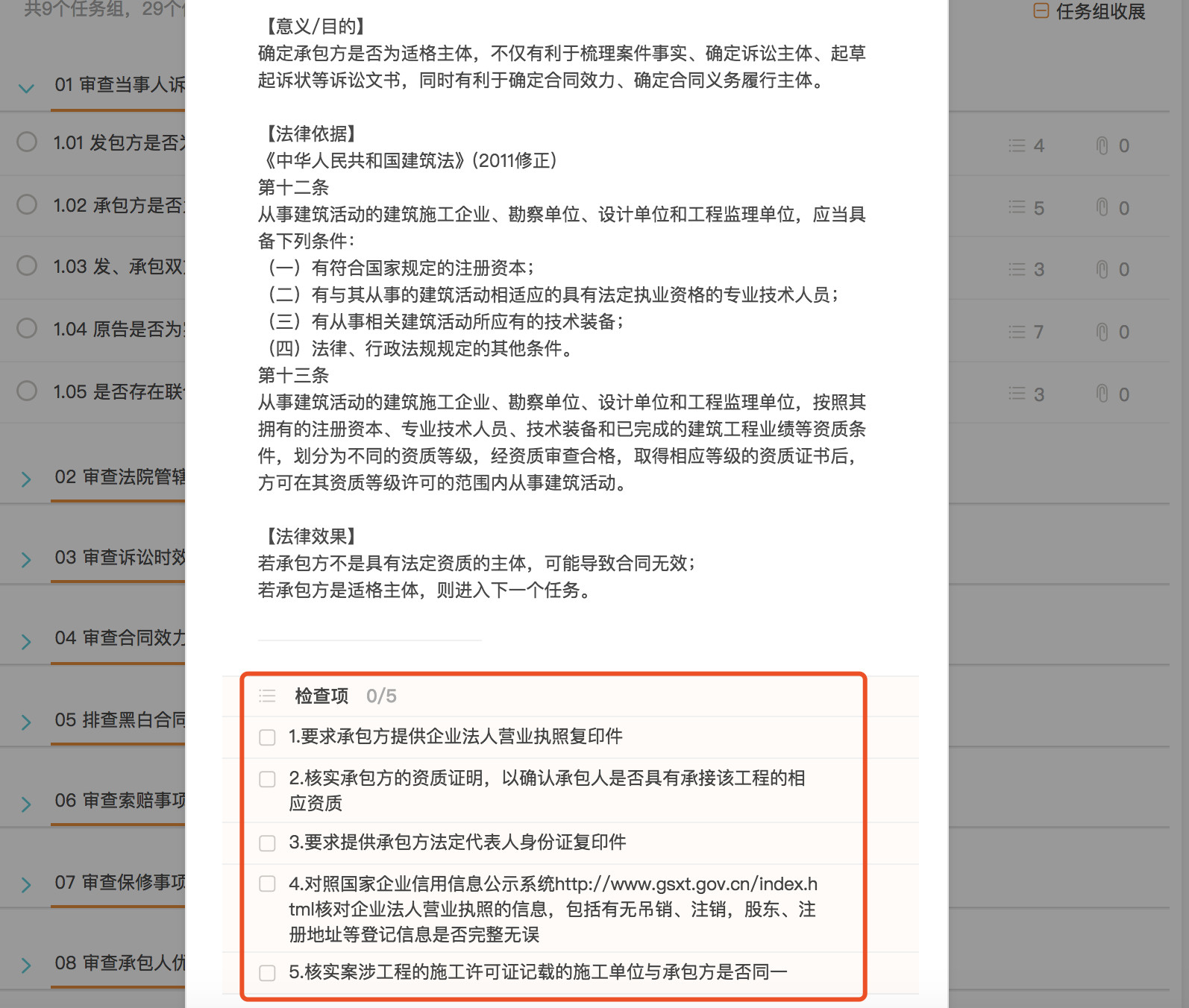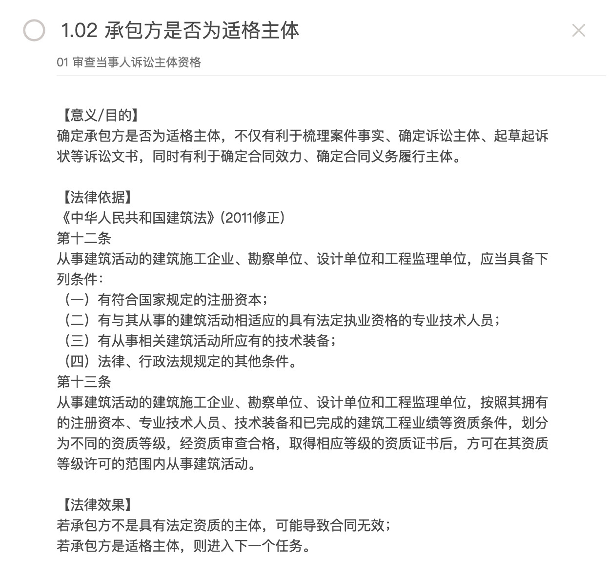 所以我们更加耐心地将所有的任务详情用更专业的文字体现出来。让律所新人也可以快速攻破建设工程施工合同纠纷的核心要点。比如有无《建筑法》规定的合同无效情形这一任务,我们在任务详情中补充了意义/目的、法律依据、法律效果。