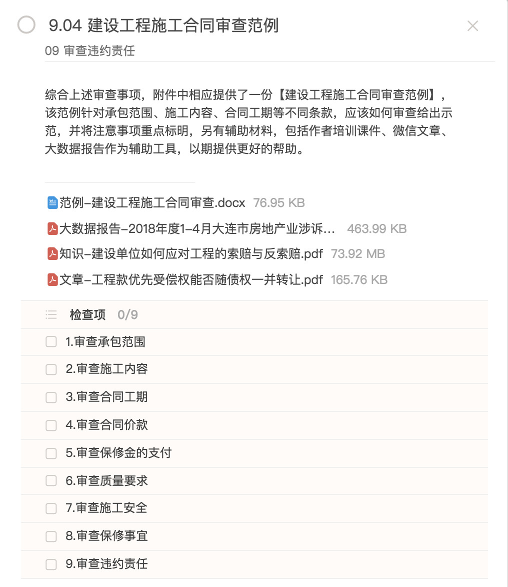 为此我们找来团队里基本没有做过建设工程施工合同纠纷的新人来看我们的模板初稿,了解他们看后还有多少问题需要再一次向有经验的律师确认,我们再会将这些问题的答案整理进检查项中。