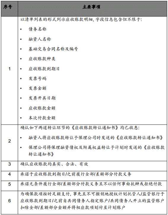 基于债务加入的交易安排明确了核心企业作为应收账款项下共同债务人的角色及其相关义务, 故在相应的《付款确认书》中, 通常会对需要共同债务人确认和承诺的事项进行相应规定, 主要事项请见下表总结和归纳: