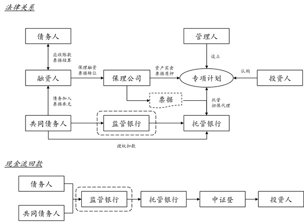 在实际的供应链业务中, 存在债务人拟以商业承兑汇票("票据")对应收账款或保理融资债权进行支付结算的操作和需求, 与票据相关的供应链金融资产证券化交易结构与仅涉及应收账款的供应链金融资产证券化类同, 特别地, 在票据的处理上, 可考虑由保理公司将票据质押予计划担保基础资产项下回款,。