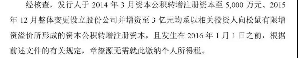 但是,对于资本公积转增实收资本或股本的部分,特别是资本公积中的资本溢价部分转增是否需要缴纳个人所得税,大家还是存在很大的争议。就如最近大家看到了,最近三只松鼠(股票代码:300783.SZ)2019年6月3日公布了《北京市中伦律师事务所关于公司首次公开发行人民币普通股股票(A股)并在创业板上市的补充法律意见书(一)》中,中伦律所认为资本公积中的资本溢价转增不应该缴纳个人所得税: