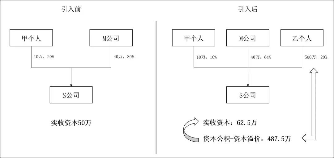 因此,乙个人增资500万进入S公司,其中12.5万进入实收资本,487.5万进入资本公积中的资本溢价。