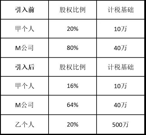 通过这几步计算我们可以看出,在引入乙个人后,S公司资本公积中的资本溢价487.5万元,并非S公司赚取的税后利润,而是来源于乙个人的资本性投入。进一步来看一下,在引入乙个人前和引入乙个人后,甲个人、M公司和乙个人持有S公司股权的计税基础: