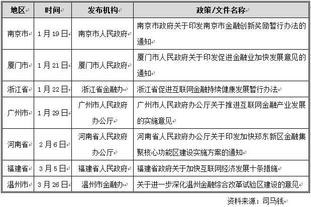 如果说2014年是互联网金融的发展元年,那么2015就是互联网金融的爆发年,互联网金融成为今年两会热议话题,国家重要领导人在今年对互联网金融也是格外重视,并不断进行走访和鼓励,就在本月,李克强总理就频频走访金融机构,力挺互联网金融的发展。除了国家层面,省、市等各级政府也将互联网金融的发展纳入重点,纷纷出台相关的支持政策,下面就让司马钱带您一览2015年那些惹眼的互联网金融政策(见下表)。
