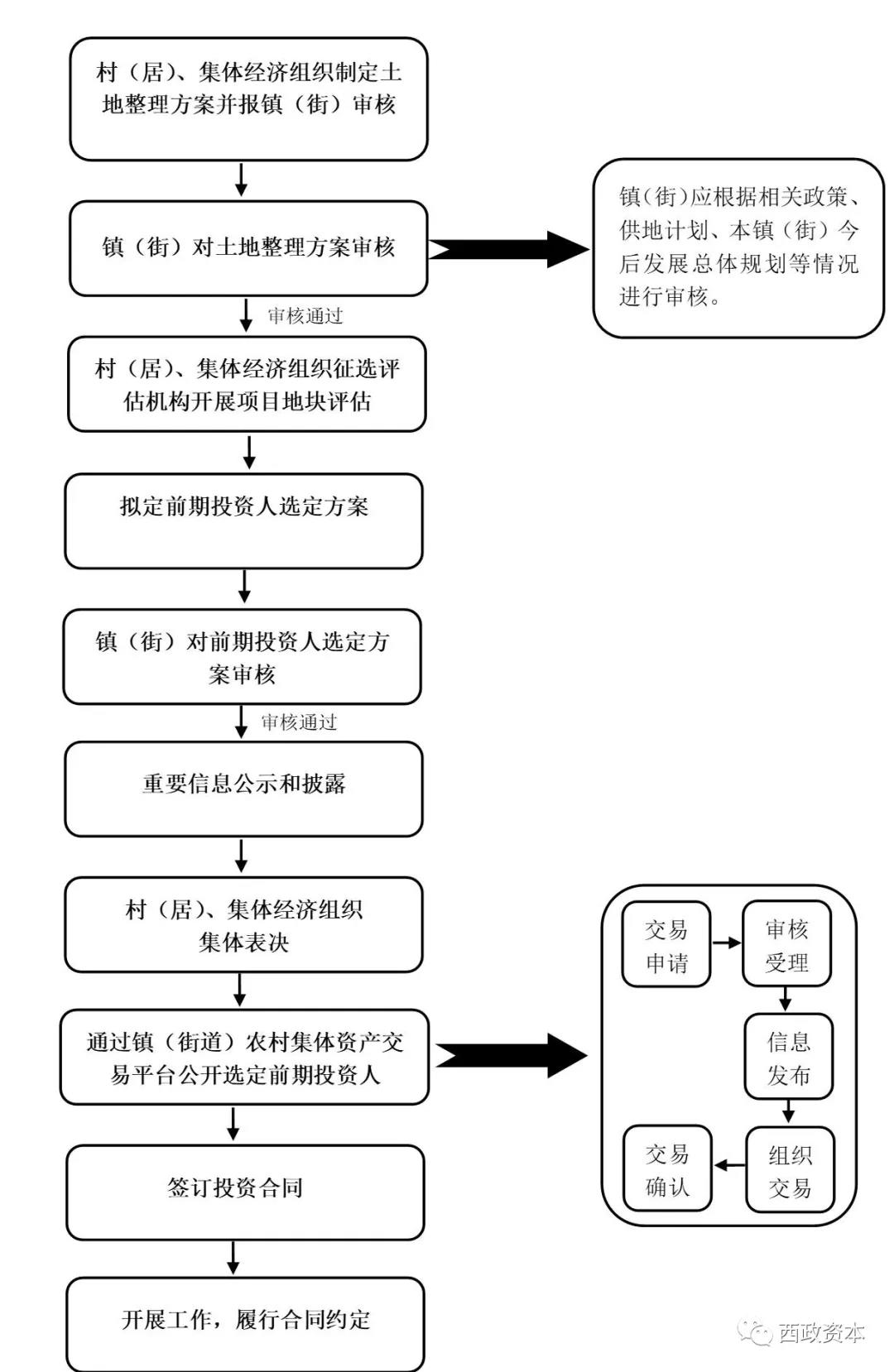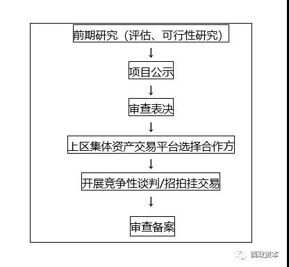 在以上6个阶段中,需多次经过原农村集体经济组织(即村股份合作公司)三会(董事会、监事会、集体资产管理委员会)审议,并经过股东大会或股东代表大会表决通过(具体经过次数各区规定不一,一般整个流程下来约1-3次)。上区集体资产交易平台选择合作方后一般有竞争性谈判、招拍挂交易两种选择方式(部分区可选择单一来源方式)。
