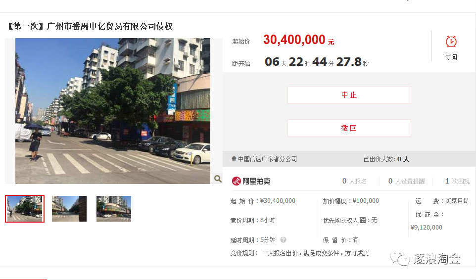 广州市番禺中亿贸易有限公司债权项目将于2019年2月1日9时至2019年2月1日17时止(延时的除外)在中国信达资产管理股份有限公司广东省分公司淘宝网资产竞价网络平台上