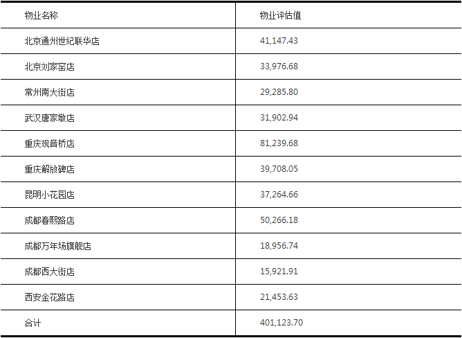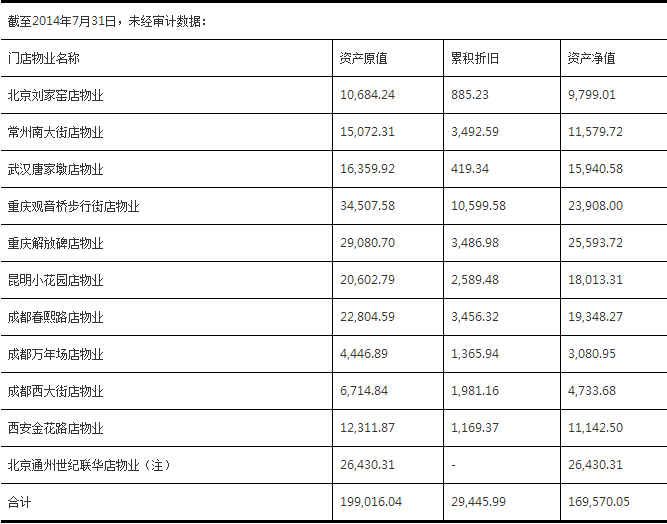注:截止2014年7月31日北京通州世纪联华店会计核算计入在建工程科目,账面价值为26,430.31万元,该处物业于2014年9月30日开业运营,会计核算上已由在建工程科目转入固定资产科目。