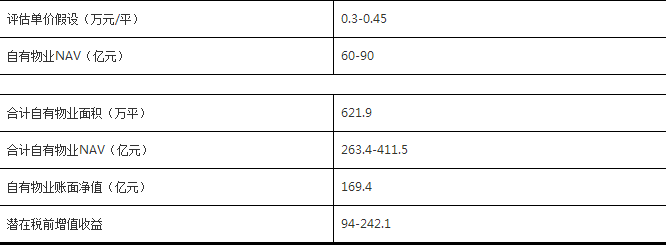 公司旗下自有物业合计面积622万平,根据市场价格测算其NAV约263-412亿元,较账面净值(2014H1:169亿元)溢价94-242亿元。