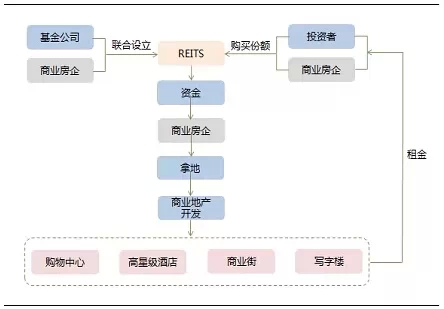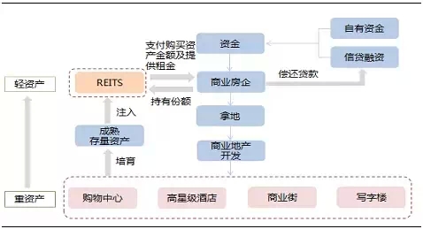 在REITS存在的情况下,商业地产行业的运转将出现精细化合作,不同风险偏好的资金将会流向商业地产运作的不同环节,进而实现资金的风险偏好与投资收益相匹配。追求高投资回报的房企将会负责商业地产的前期开发以及培育,然后将培育成熟的商业物业出售给REITS,实现退市套现,迅速回笼资金,提高了IRR,并且缩短了投资回报周期,而追求稳健收益的投资者将会通过持有REITS份额获得经营商业物业过程中的持续稳定的租金分红收益。