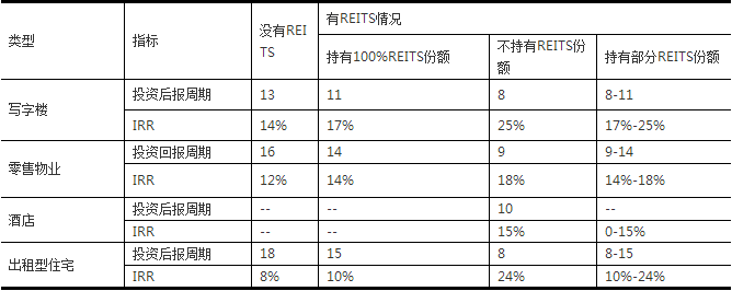 通过测算可以发现,在有REITS的情况下,商业地产企业通过将其所持有的商业物业(无论是写字楼、零售物业、出租型物业还是酒店)出售给REITS实现退市套现、回笼资金,进而提高了IRR和缩短了投资回报周期,而这也是REITS对商业地产企业最大的影响。