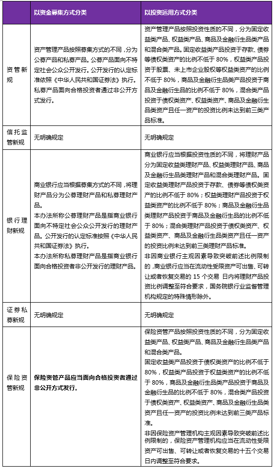 综上,以资金募集方式对资管产品进行分类时,银行理财产品可包括以公开方式向社会公众发行的公募产品和以非公开方式向合格投资者发行的私募产品,而信托计划、资产管理计划、保险资管产品均是以非公开方式向合格投资者发行的私募产品。以投资方式对资管产品进行分类时,配套细则与《资管新规》保持一致,均设置固定收益类产品、权益类产品、商品及金融衍生品类产品和混合类产品,且均以同样的投资比例作为认定标准。