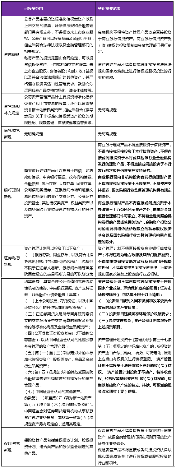 对于资管产品投资范围,《资管新规》从可投资范围及禁止投资范围两方面进行规范,配套细则对此进行了补充,详见下表: