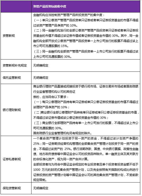 《资管新规》及其配套细则对于资管产品所投资资产的集中度进行了限制,以减少投资过于集中产生系统性风险的可能性,详见下表: