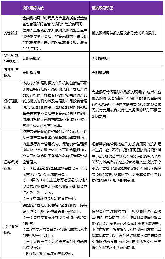 《资管新规》允许资管产品聘请投资顾问,各配套细则对于投资顾问的具体资质及职责作出了细致规定,详见下表: