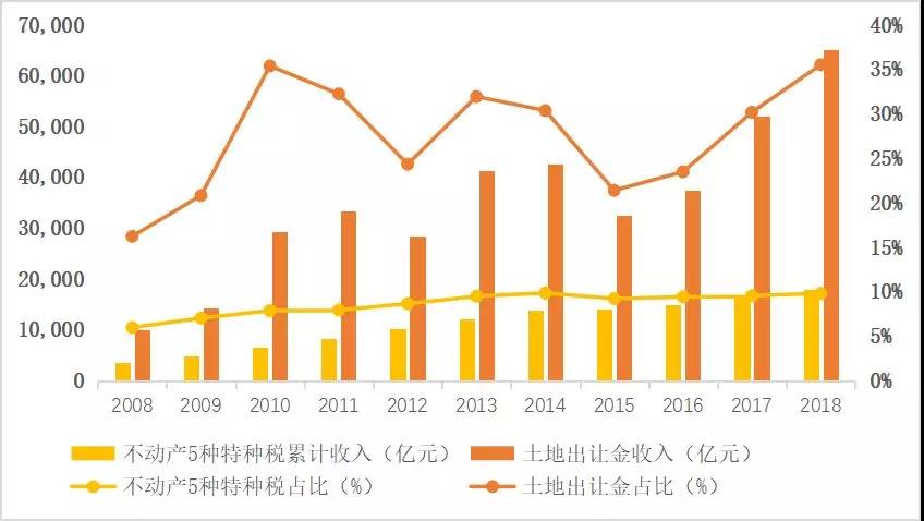 一是整体税负不高。从征收力度来看,城镇土地使用税、耕地占用税、土地增值税、契税、房产税这5项房地产特有的税种在2018全国公共财政收入中占比分别为1.30%、0.72%、3.08%、3.13%和1.58%,每一项比重均不超过4%,累计占比不到10%,远低于土地出让金35.5%的比重,整体税负较低。