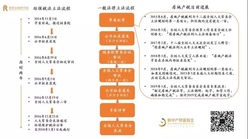 考虑到房地产税的复杂性,未来立法应该需要人大常委会进行两次或三次审议,而人大常委会每两个月召开一次,那么最快也需要四到六个月才能完成审议,而每次公开征求意见至少需要30日,新一轮税改后第一个出台的地方新税种的环保税从提交草案至表决通过历时两年,一年后才开始全面开征。所以房地产税今年不太可能仓促出台,最快也得2020年。但也不会太久,因为2018年房地产税法被列入全国人大常委会五年立法规划的第一类项目,意味着房地产税比较成熟,不出意外的话会在2023年3月本届人大任期结束前完成立法或提请审议。