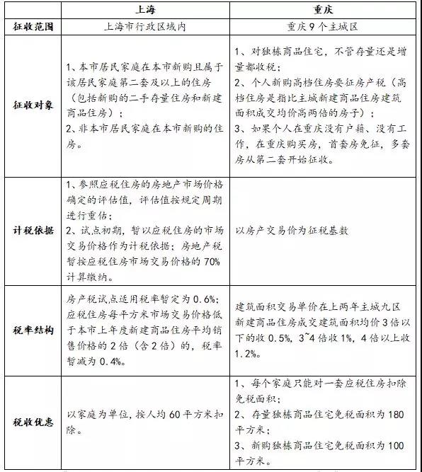 资料来源:《上海市开展对部分个人住房征收房产税试点的暂行办法》、《重庆市关于开展对部分个人住房征收房产税改革试点的暂行办法》、如是金融研究院