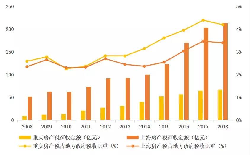从上海和重庆试点情况来看,2011年开征后房产税收入和在地方政府税收占比