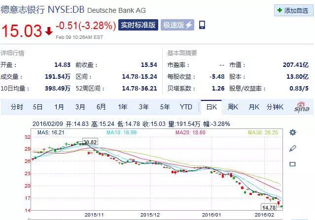 目前德银的股价已经低于上次金融危机的低点,特别是进入2016年更是下跌近四成,情况有加速恶化的征兆。