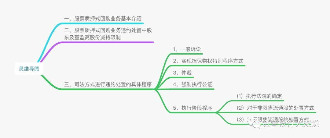 通过司法方式进行股票质押式回购业务违约处置的,无论是通过一般诉讼程序、实现担保物权特别程序、仲裁程序还是强制执行公证程序,最终实现债权都是通过强制执行程序。
