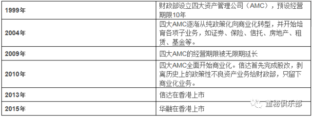 前两轮的不良资产处置主要是政策性的,不良资产经营业务主要由四大资产管理公司(华融、信达、东方、长城,后文简称“四大AMC”)经营;因此,四大AMC的发展历史也是不良资产行业的发展历史。