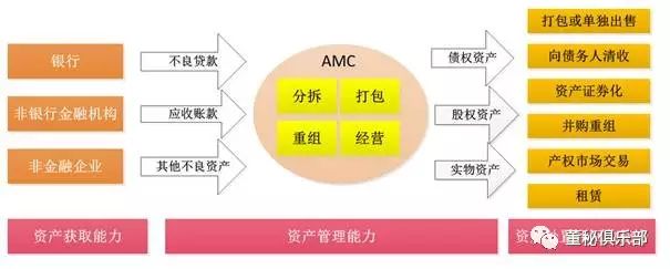 首先,AMC从银行、非银行金融机构或者企业那里获得不良资产,然后通过对资产的分拆、打包、重组、经营等对资产进行管理,转换为相对正常的资产,最后再通过各种各样的处置手段,将资产进行处置、回收。