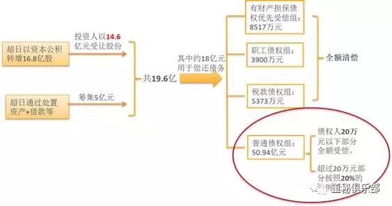 归还债权的资金则来自于两部分:超日太阳以资本公积-股本溢价转增股本16.8亿股,由超日太阳的现有全体股东无偿转让、并由协鑫等9家投资人有条件受让,9家投资人受让上述转增股份应支付14.6亿元;再加上超日太阳通过处置境内外资产和借款等方式筹集的不低于5亿元,合计不低于19.6亿元将用于支付重整费用、清偿债务、提存初步确认债权和预计债权以及作为超日太阳后续经营的流动资金(实际操作时,则是9家投资人先将资金作为免息借款借给超日太阳,破产重整完成后,再用于认购公司资本公积转增股本的对价,而超日全体原股东,则将自己资本公积转增股本的对应权益,无偿让渡给9家投资人、即被稀释)。