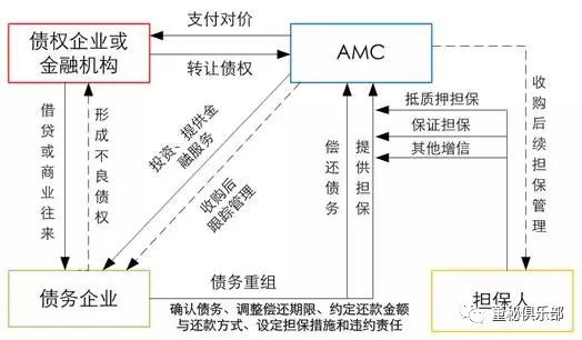 AMC与债权企业、债务企业三方达成重组协议,向债权企业收购债权,同时与债务企业及其关联方达成重组协议,通过还款时间、金额、还款方式以及担保抵押等一系列的重组安排,实现未来债权的回收。具体业务模式见图。