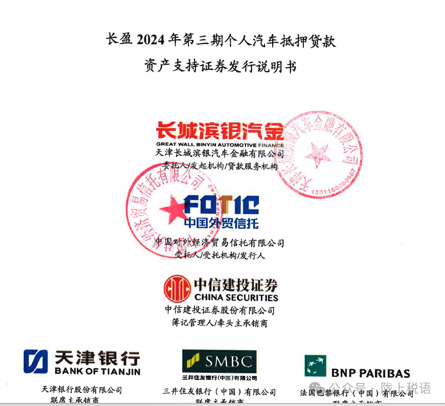 同时,根据《长盈2024 年第三期个人汽车抵押贷款证券化信托主定义表》,信托账户中的保管资金将被受托机构用于合格投资,合格投资系指受托人将信托账户内的资金在闲置期间按《信托合同》的约定投资于以人民币计价和结算的与合格实体进行的金融机构存款。合格实体系指排除农村商业银行、村镇银行之外的,且经受托机构认可的银行业金融机构。