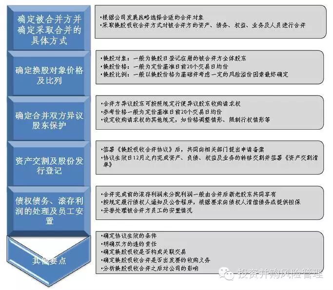 在一次换股合并交易中,一般要经过董事会、股东会表决,签订协议(确定价格和支付条件等),债权人保护,公司合并等主要程序。其主要程序及内容如下图: