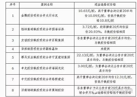 由上表可以看出,现金选择权的价格一般与换股价格相同,为董事会决议公告日前20个交易日均价。即使高于20个交易日均价,幅度也不会很大,且均低于换股价,因为,若现金选择权价格过高,则投反对票的股东增加,往往使得该项合并不能完成。因此即使有溢价,也会低于换股价格,如此,更多的股东会选择换股,以保证议案通过。